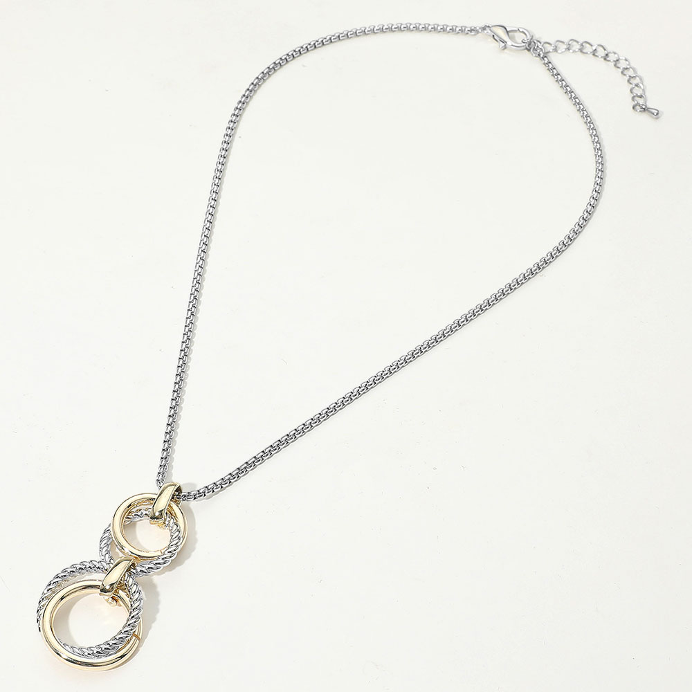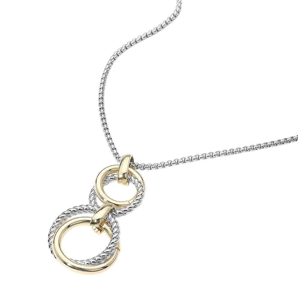Details • Necklace Size : 17" + 2.5" L • Pendant Size : 1" X 2" • Elegant pendant necklace featuring interlocking rings with a mix of smooth and twisted textures. A refined accessory designed for everyday sophistication or special occasions, suspended from a delicate chain for a modern, timeless look. • Gold Dipped