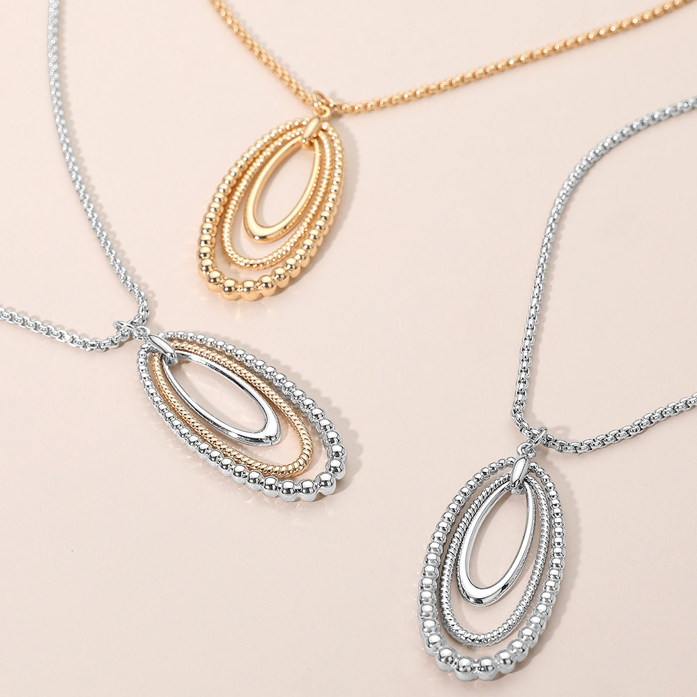 • Chic layered oval pendant necklace featuring smooth and beaded-edge loops for a refined dimensional look. A versatile statement accessory that pairs effortlessly with both casual and dressy outfits, adding timeless elegance and modern charm to any style.