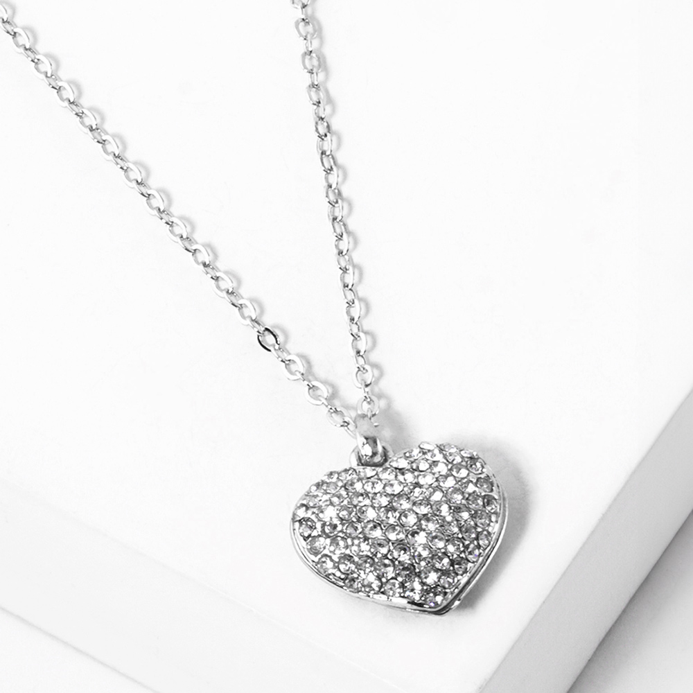 Details • Necklace Size : 15.5" + 2" L • Pendant Size : 0.7" X 0.6" • Shimmering rhinestone heart pendant necklace featuring a dazzling pave design that adds radiant sparkle to any look. Perfect for everyday wear or gifting, this charming heart necklace offers timeless style and a touch of romantic shine for any occasion. • Lead and Nickel Compliant