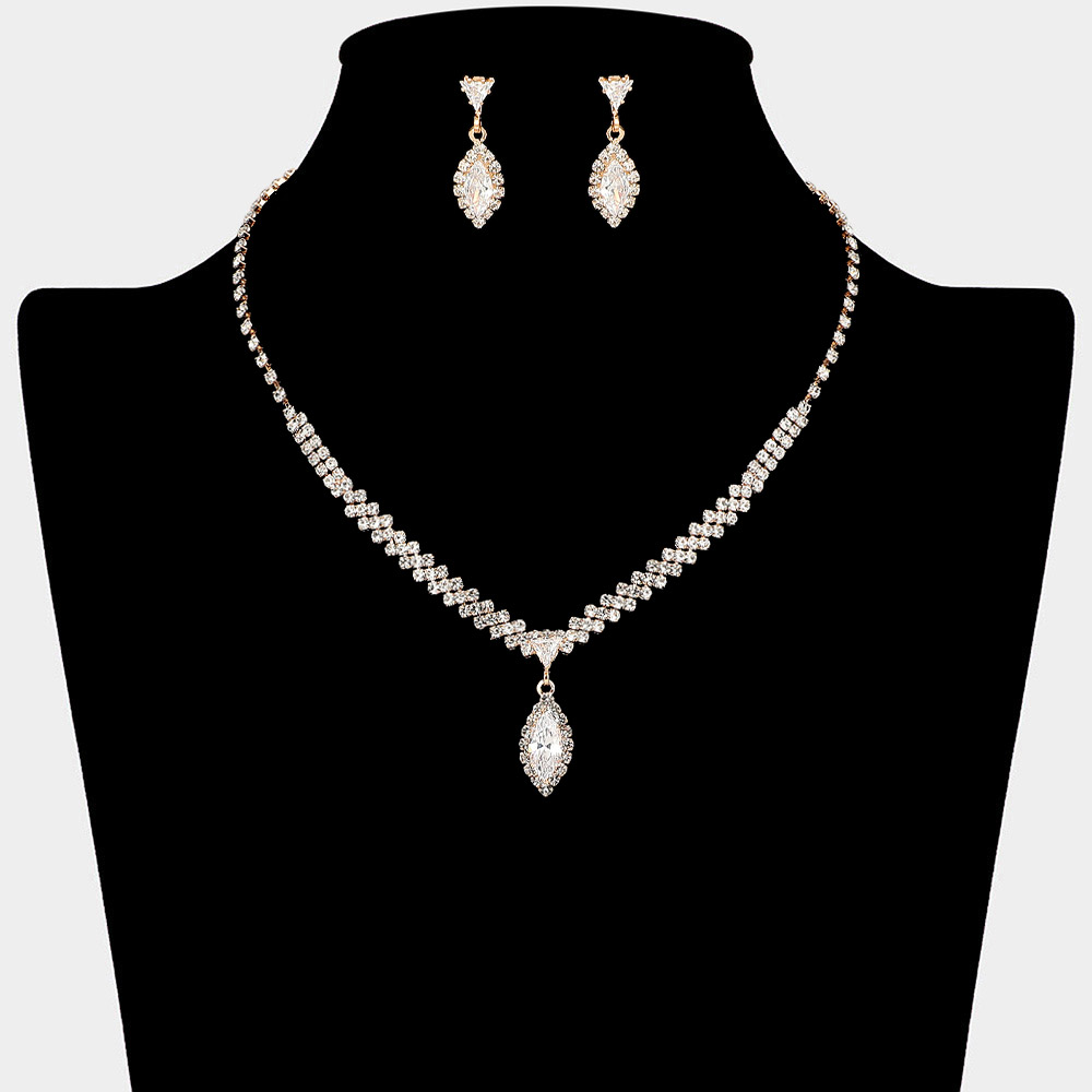 Details • Necklace Size : 14" + 5" L • Decor Size : 1.2" L • Earrings Size : 1" L • Elegant jewelry set featuring a crystal teardrop pendant necklace with matching earrings. The sparkling rhinestone accents and refined setting create a timeless look, perfect for weddings, evening events, or adding sophistication to any formal outfit. • CZ Cubic Zirconia • Lead and Nickel Compliant