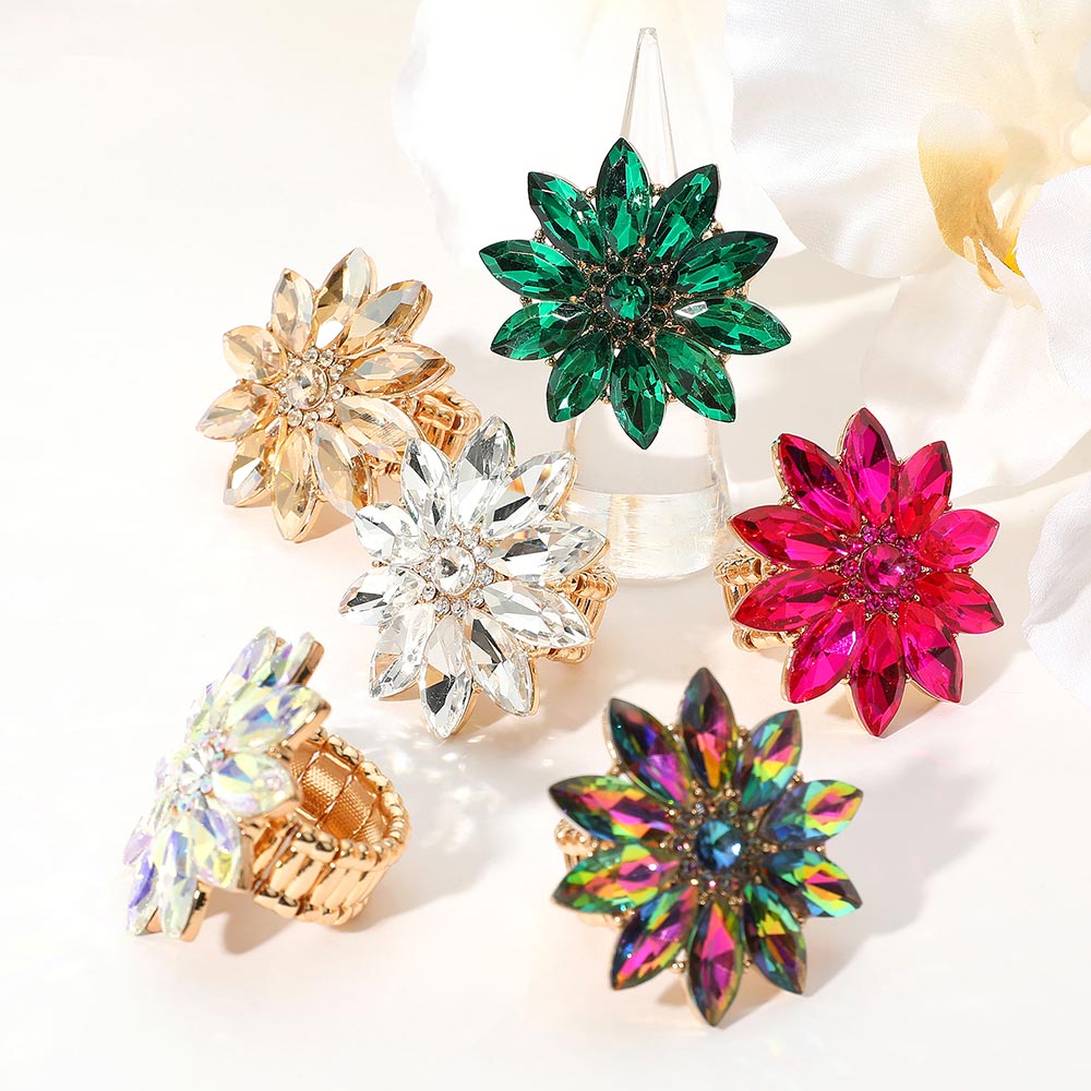 Details • Size : 1.6" H • Stretchable • Make an unforgettable impression with this floral statement ring, featuring oversized faceted gemstones arranged in a radiant petal design. Bold and elegant, this eye-catching accessory adds dazzling sparkle and a touch of luxury to evening wear, special occasions, or fashion-forward looks. • Lead and Nickel Compliant