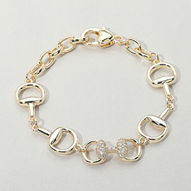14K Gold Plated CZ Stone Paved Horsebit Accent Chunky Cuban Chain Bracelet