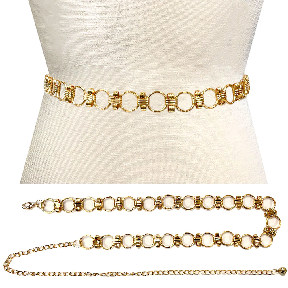 Details • Size : 1.2" H, 14" + 32" L • Elevate your look with this geometric link waist belt featuring a bold pattern of interlocking shapes. Designed for a sleek, sophisticated finish, it adds a touch of modern luxury to any outfit, making it the perfect accessory for chic and confident styling. • Lead and Nickel Compliant