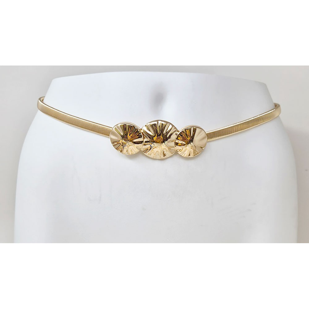 Triple Textured Round Buckle Accent Slim Metal Stretch Belt