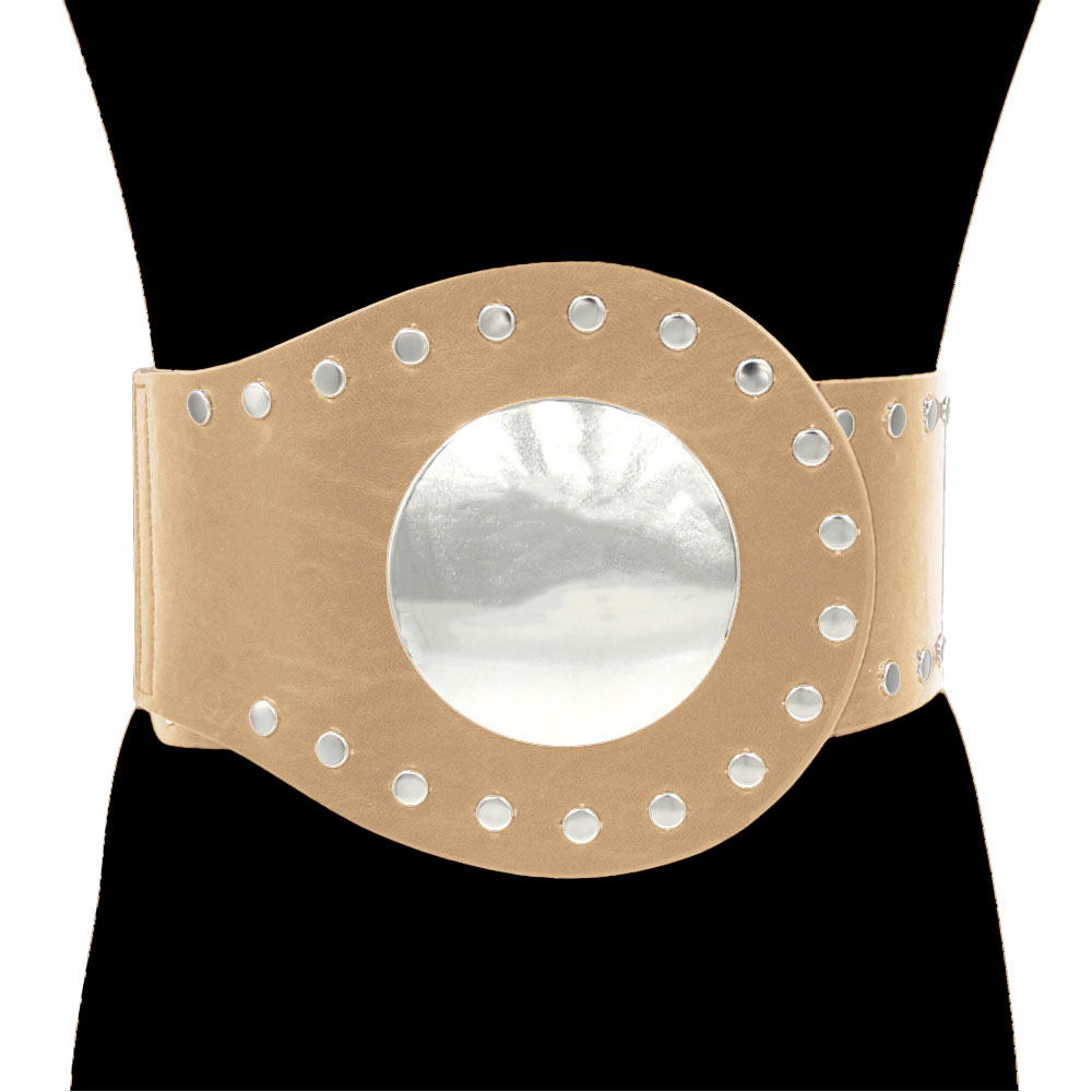 • This studded wide statement waist belt features a bold circular buckle with metallic accents that command attention. Designed to accentuate the waist with a contemporary edge, it adds a confident, high-fashion finish to dresses or tunics. Perfect for a chic and standout look.