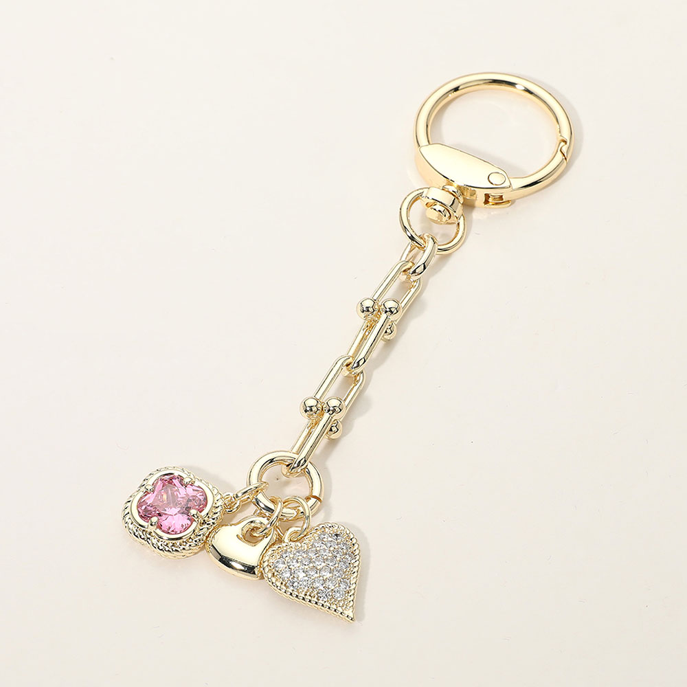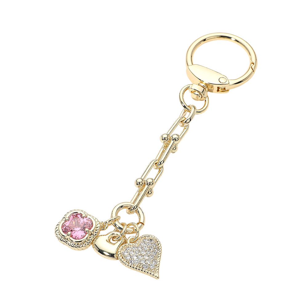 Details • Size : 5" L, 1" X 3.5" • This multi heart charm keychain features layered heart-shaped accents with sparkling crystal-style details suspended from a sleek linked chain. Designed to add shine and personality to keys or bags, it’s ideal for boutiques seeking romantic, giftable accessories that blend decorative charm with everyday functionality. • CZ Cubic Zirconia • Gold Dipped