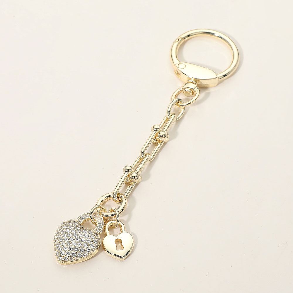 Details • Size : 5" L, 0.8" X 3.25" • This heart lock charm keychain features a crystal-accented heart paired with a smaller lock detail, suspended from a sleek linked chain. Designed to add sparkle and meaning to keys or bags, it’s ideal for boutiques seeking romantic, giftable accessories that blend modern style with everyday functionality. • CZ Cubic Zirconia • Gold Dipped