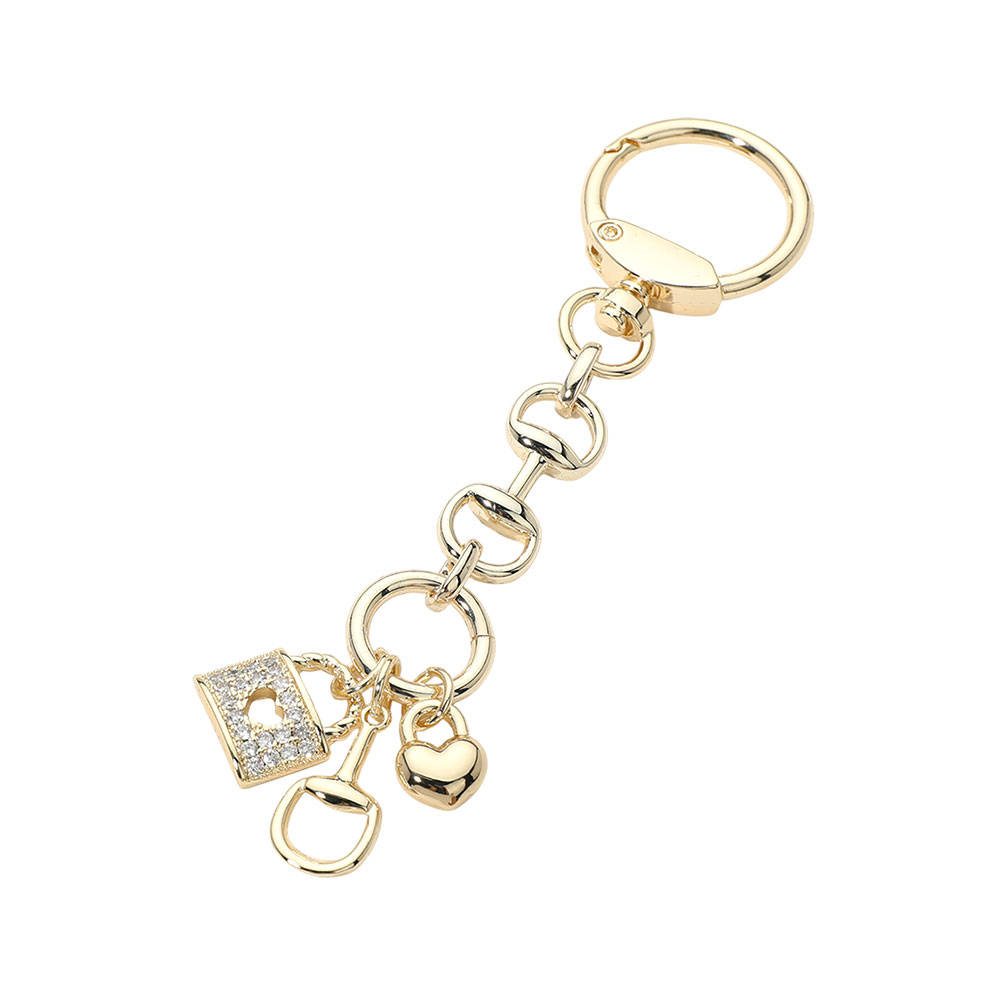 Details • Size : 4.75" L, 0.8" X 3.1" • This charm keychain features a lock motif paired with heart and ring accents suspended from a linked chain design for a playful yet polished look. Designed to attach easily to keys or bags, it’s ideal for boutiques seeking giftable accessories that combine symbolic charm, decorative detail, and everyday functionality. • CZ Cubic Zirconia • Gold Dipped