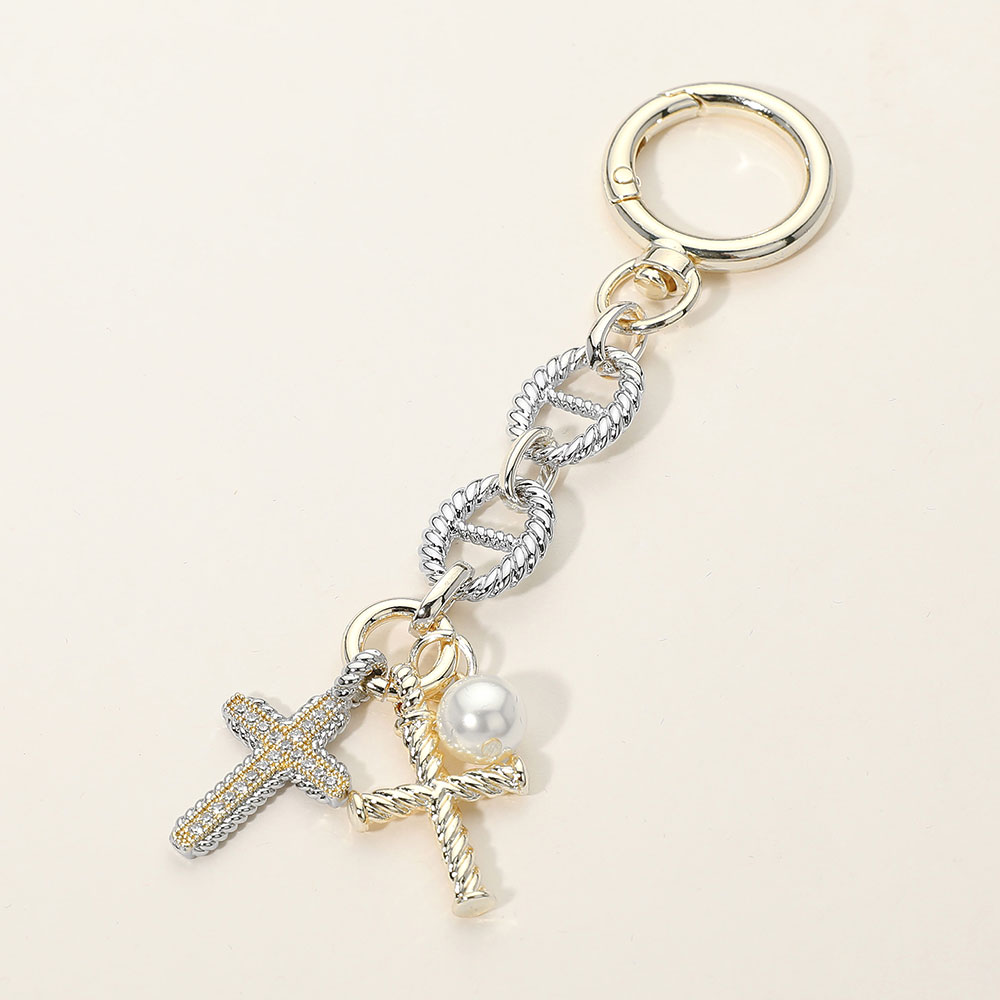 Details • Size : 4.75" L, 1" X 3" • This charm keychain features a cross accent paired with pearl-inspired and textured details suspended from linked chain elements for a meaningful, elegant look. Designed to attach easily to keys or bags, it’s ideal for boutiques seeking giftable accessories that blend symbolic style, refined detail, and everyday functionality. • CZ Cubic Zirconia • Gold Dipped