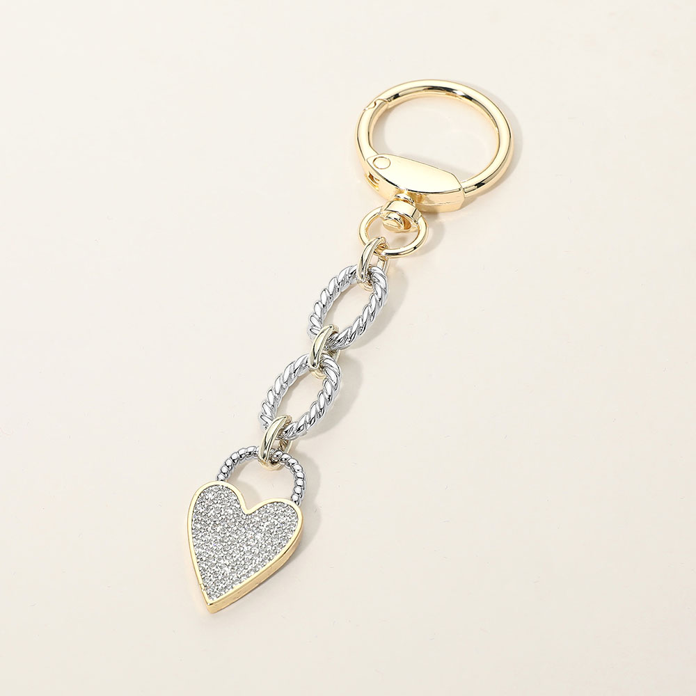 Details • Size : 4.75" L, 0.75" X 3.25" • This crystal heart charm keychain features a sparkling heart accent suspended from linked chain elements for a refined yet romantic statement. Designed to attach easily to keys or bags, it’s ideal for boutiques seeking giftable accessories that combine shine, charm, and everyday functionality with modern appeal. • CZ Cubic Zirconia • Gold Dipped