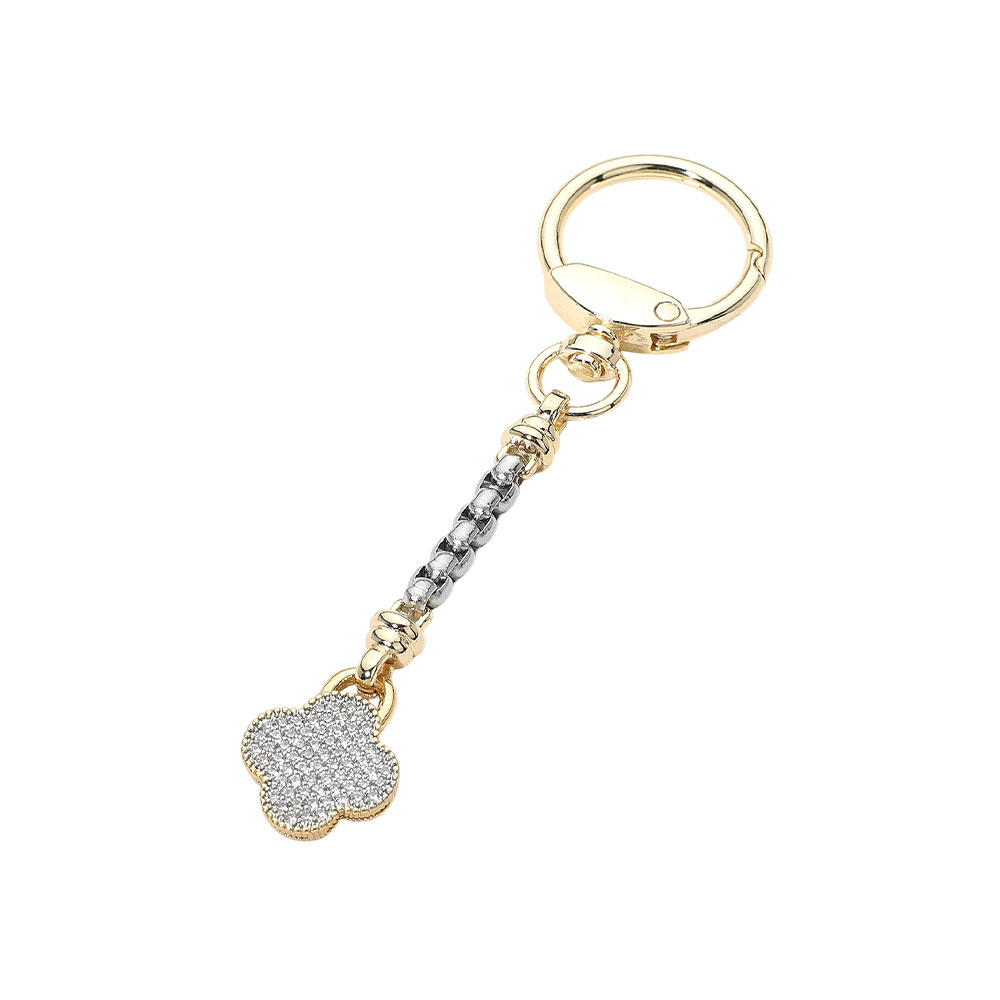 14K Gold Plated CZ Stone Paved Quatrefoil Charm Drop Keychain Bag Charm