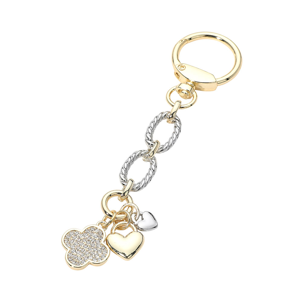 Details • Size : 5" L, 1" X 3.3" • This multi charm keychain features heart and quatrefoil motifs accented with crystal-style details and linked chain elements for a playful yet polished look. Designed to add charm and shine to keys or bags, it’s ideal for boutiques seeking giftable accessories that blend personality, sparkle, and everyday functionality. • CZ Cubic Zirconia • Gold Dipped