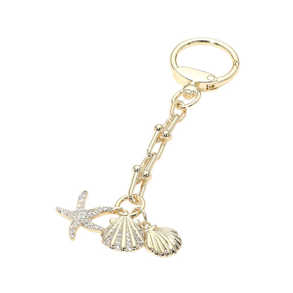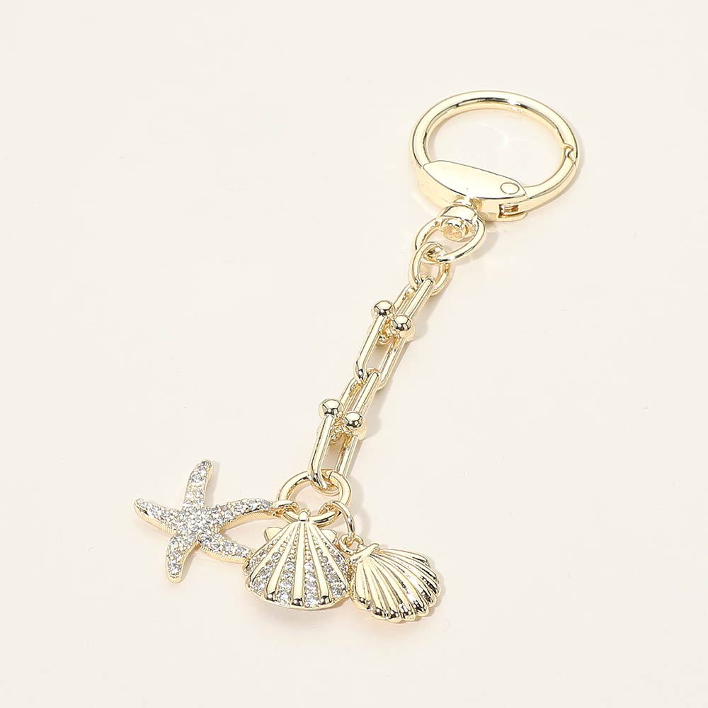 Details • Size : 4.75" L, 1.2" X 3.2" • This ocean-inspired charm keychain features a starfish and shell motif accented with sparkling crystal details and a stylish chain drop. Designed to add a coastal touch to keys, handbags, or accessories, it offers everyday function with decorative appeal. A versatile accessory ideal for beach-themed collections, gifting, or boutique displays, bringing playful elegance and charm to any look. • CZ Cubic Zirconia • Gold Dipped