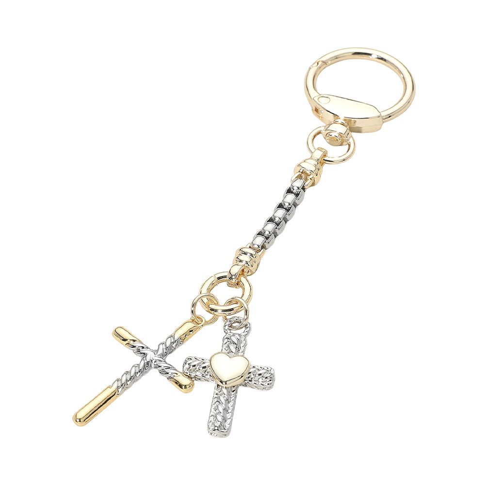 Details • Size : 5.5" L, 1" X 3.8" • Elegant cross charm keychain featuring dual textured cross pendants with a central heart accent and sturdy swivel clasp for easy attachment to keys, handbags, or backpacks; a stylish everyday accessory ideal for gifting, faith-inspired looks, or adding a refined statement to daily carry essentials. • Gold Dipped