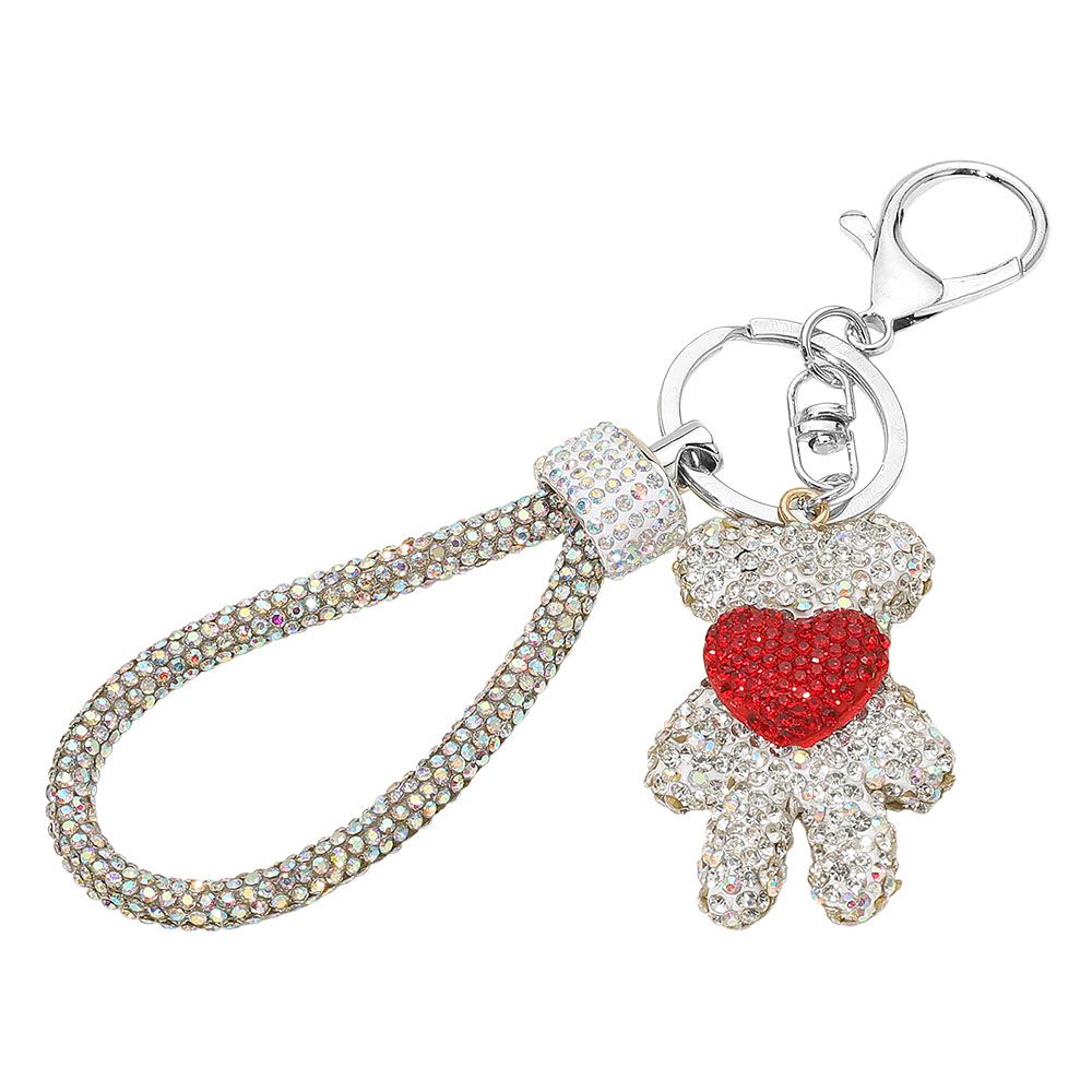 Details • Size : 5" L, 1.4" X 2.2" • Charming heart bear rhinestone keychain with matching strap, designed with sparkling stones and a secure clasp. Perfect for bags, keys, or gifting, this adorable accessory adds a touch of shine and playful style to everyday carry items. • Lead and Nickel Compliant