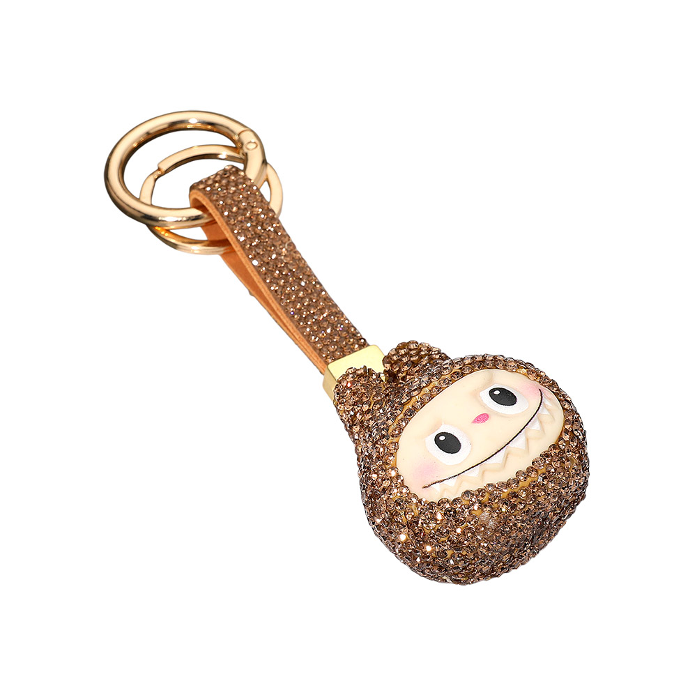 Details • Size : 1.7" X 2", 5.5" L • Adorable character keychain embellished with sparkling rhinestones and a matching wrist strap. Perfect for decorating handbags, backpacks, or car keys. A fun and stylish accessory that adds charm, shine, and personality to your everyday essentials or makes a delightful gift.