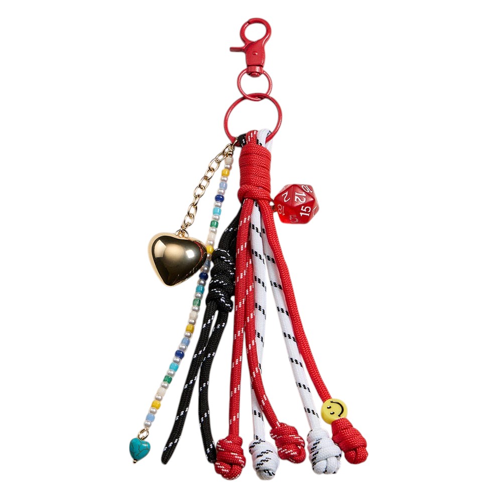 • Bold keychain featuring colorful ropes, a red polyhedral dice, beads, and playful charms like a heart and smiley—perfect for bags, backpacks, or game night accessories.