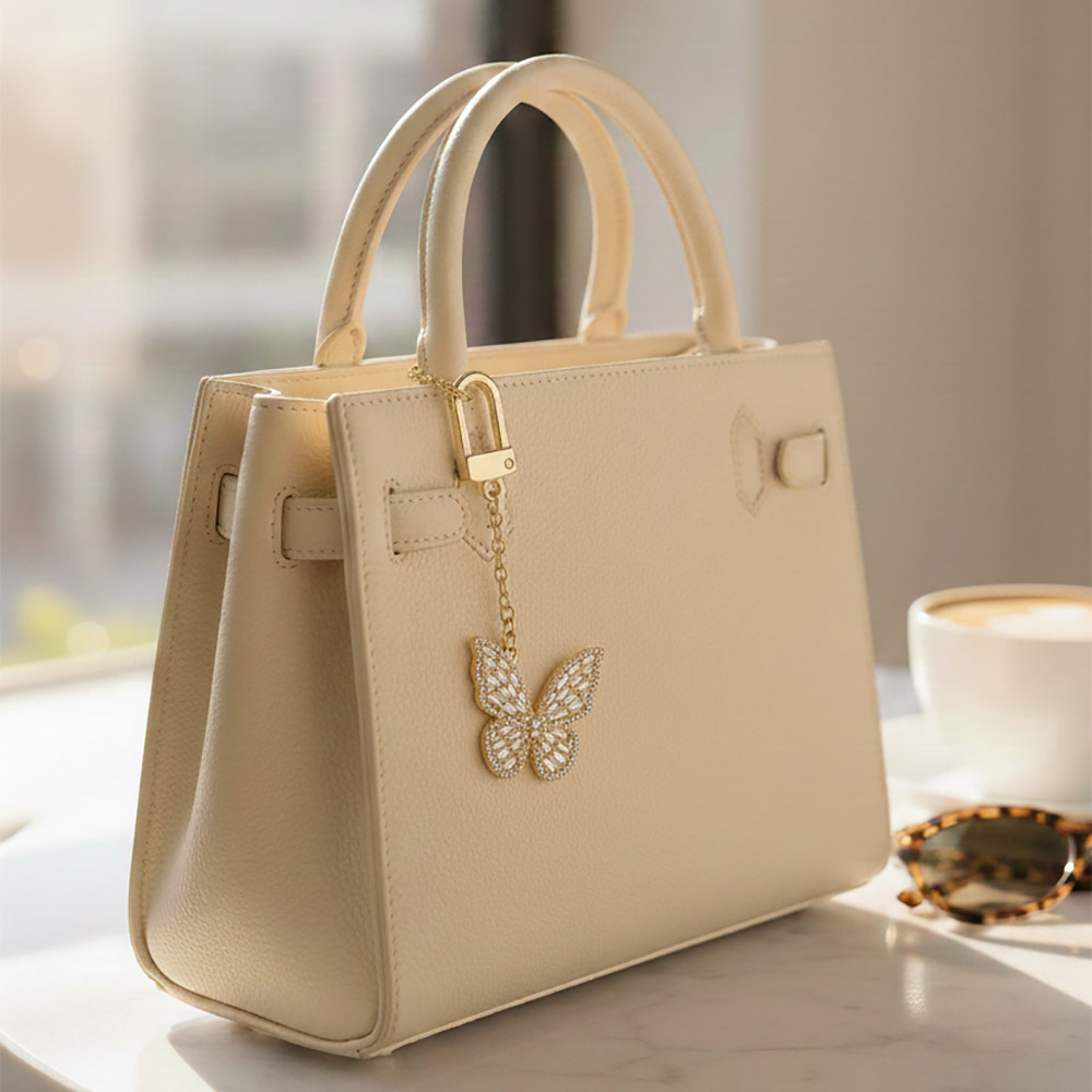 • Elegant butterfly bag charm designed with shimmering crystal accents for a graceful, eye-catching statement. Clips easily onto handbags, totes, backpacks, or keys to add movement and shine. A stylish accessory perfect for gifting, seasonal collections, and boutique displays seeking feminine charm.