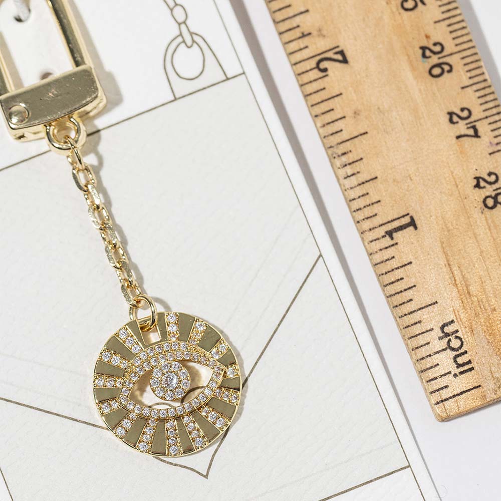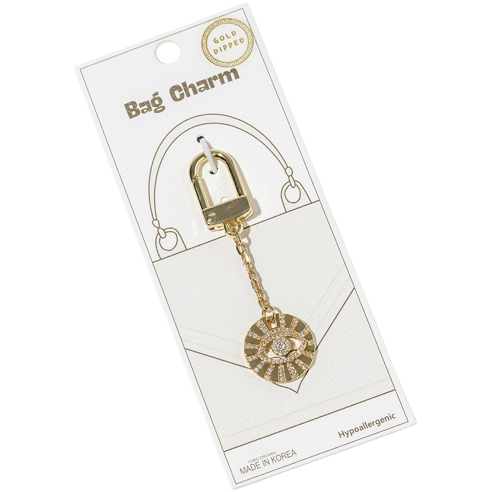 Details • Size : 2.8" L, 0.8" X 1.8" • Protective evil eye bag charm designed with sparkling crystal accents for a stylish and symbolic statement. Easily clips onto handbags, totes, backpacks, or keys to add shine and meaning. A trendy accessory ideal for gifting, everyday use, and boutique collections seeking charm with personality. • CZ Cubic Zirconia • Gold Dipped • Hypoallergenic • Lead and Nickel Compliant • Made In Korea