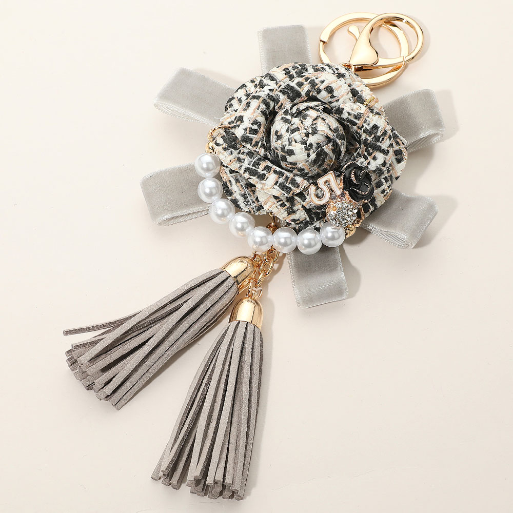 Number Five Pearl Accent Tweed Flower Bow Tassel Keychain Bag Charm Number Five Pearl Accent Tweed Flower Bow Tassel Keychain Bag Charm