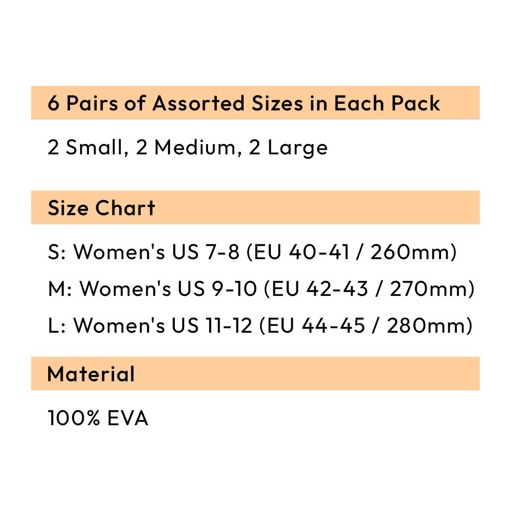 Details • Size : 6 Pairs Assorted size in each pack • 2 Small, 2 Medium, 2 Large • S Size : US 7 ~ 8 (37-38) • M Size : US 9 ~ 10 (39-40) • L Size : US 11 ~ 12 (44-42) • Material : 100% EVA • Everyday clog style footwear featuring a breathable perforated design, cushioned footbed, and flexible heel strap for wear as a slide or secure fit. Lightweight and easy to style for casual days and travel.