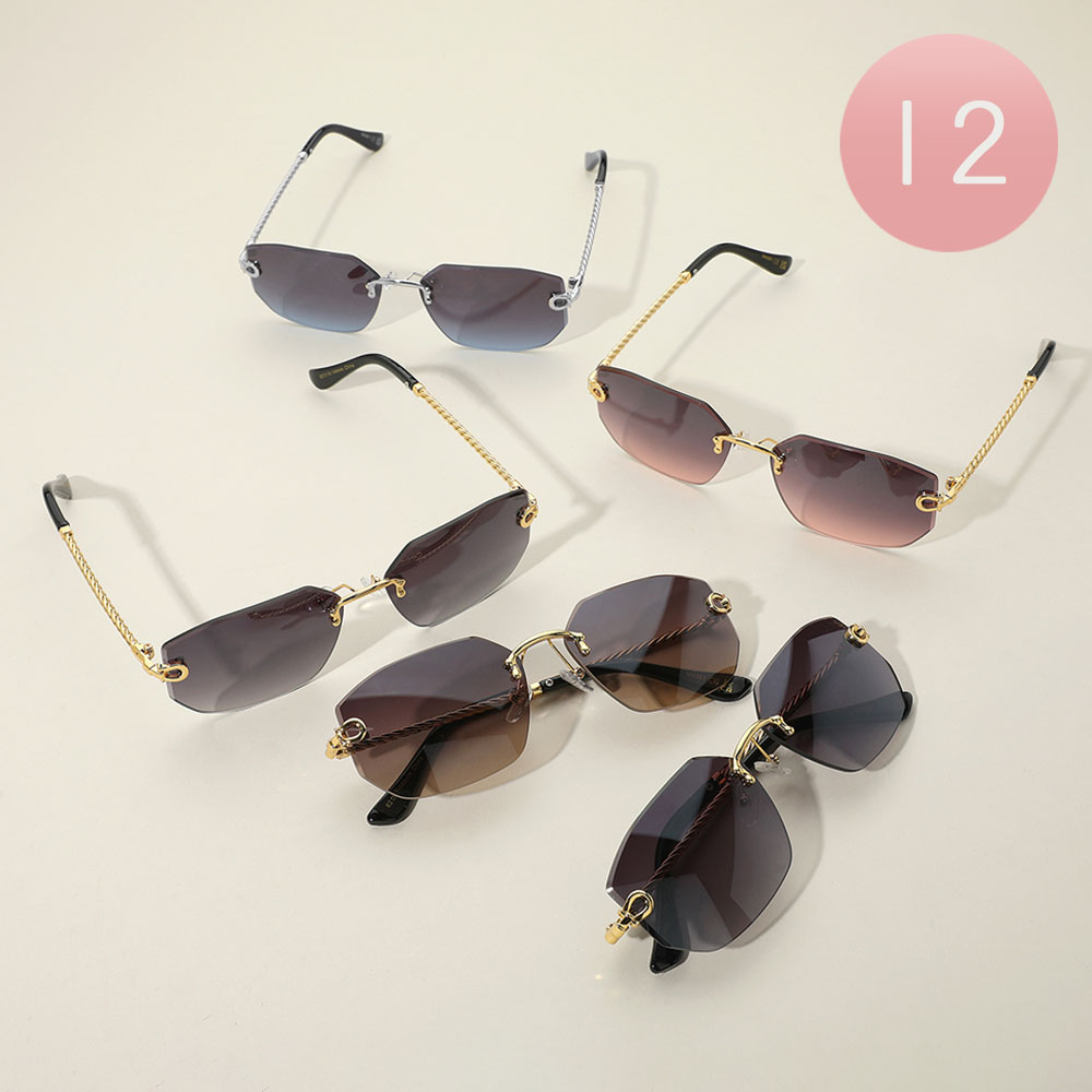 Details • Size : 5.75" X 1.7" • UV Protection • Stylish and modern, these rimless geometric sunglasses feature twisted metal temples and lightweight frames. Assorted colors with full UV protection, perfect for fashion-forward looks and curated retail collections.