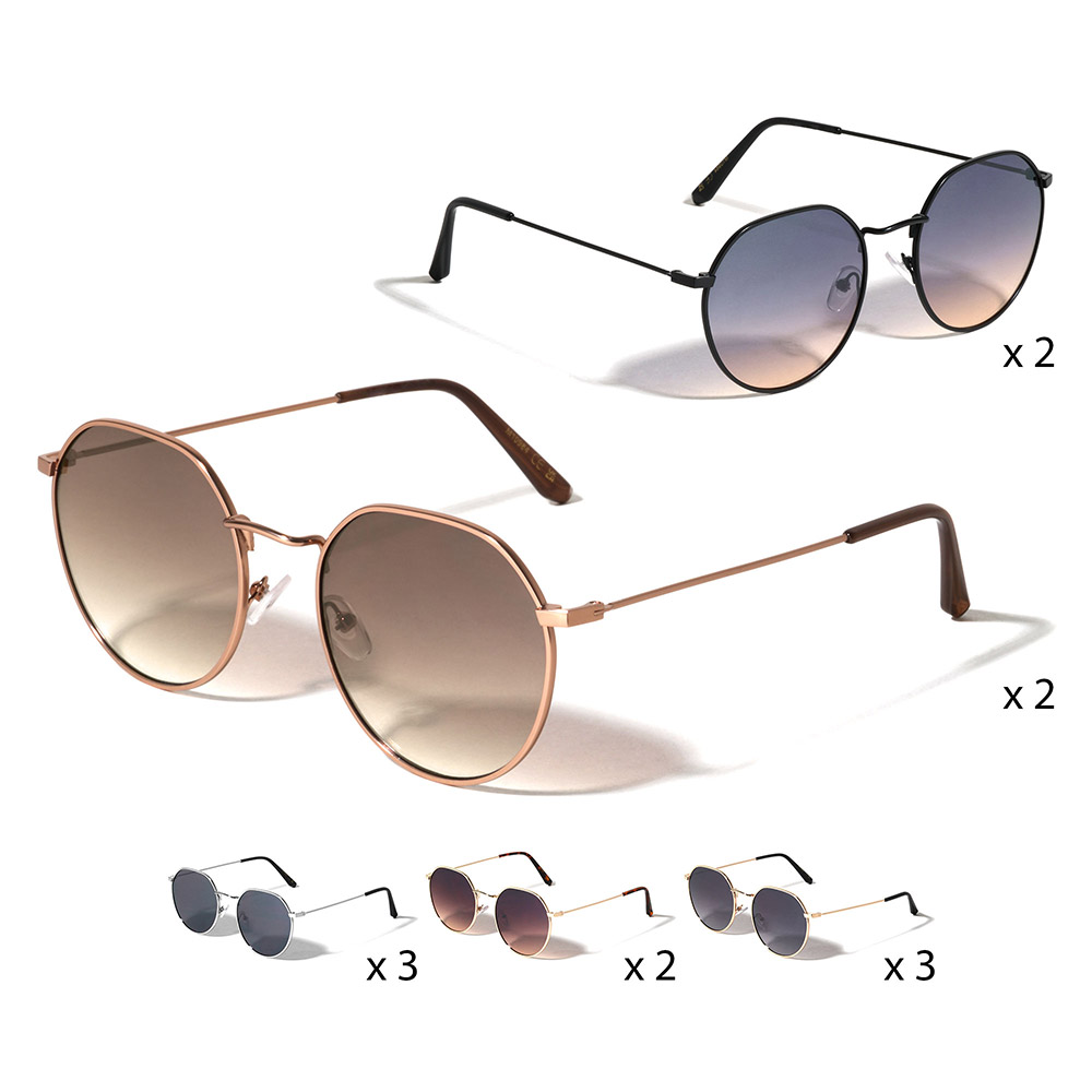 Details • Size : 5" X 2" • UV Protection • Round wire frame fashion sunglasses multipack designed for trendy everyday styling and resale versatility. Lightweight silhouettes offer a modern vintage look suitable for casual outfits, seasonal collections, and accessory displays with mixed shapes for added retail appeal.