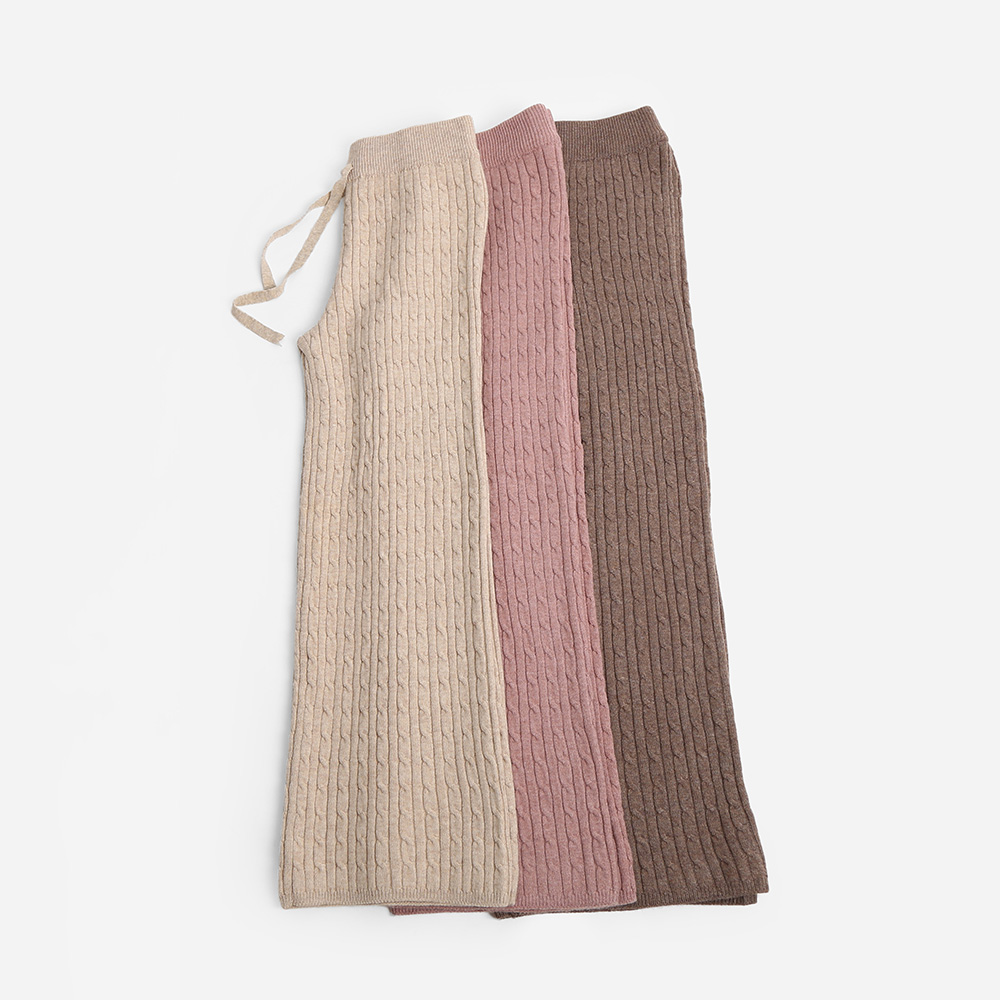 Details • Size : One Size • Material : 65% Polyester, 35% Acrylic • Features : Adjustable drawstring and elastic waistband • Care : Machine wash on the cole and gentle cycle, do not bleach, lay flat to dry or tumble dry on low, iron or steam on low, do not dry clean • Cozy cable knit lounge pants designed with a relaxed wide-leg silhouette and adjustable drawstring waist for a custom fit. Crafted for ultimate comfort, these soft knit pants are perfect for casual days, lounging at home, travel, or effortless everyday style. Pair them with sweaters, crop tops, or loungewear sets for a chic and cozy look you'll love to wear all season long.