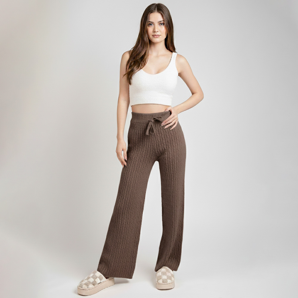 • Cozy cable knit lounge pants designed with a relaxed wide-leg silhouette and adjustable drawstring waist for a custom fit. Crafted for ultimate comfort, these soft knit pants are perfect for casual days, lounging at home, travel, or effortless everyday style. Pair them with sweaters, crop tops, or loungewear sets for a chic and cozy look you'll love to wear all season long.