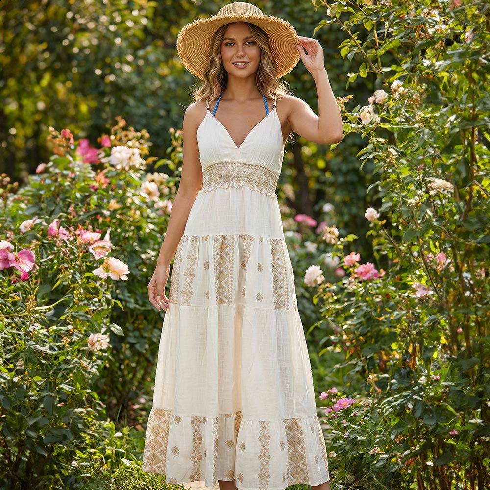 • Elegant white maxi dress with intricate embroidery, smocked waist, and spaghetti straps—perfect for beach vacations, summer dates, and casual outings.