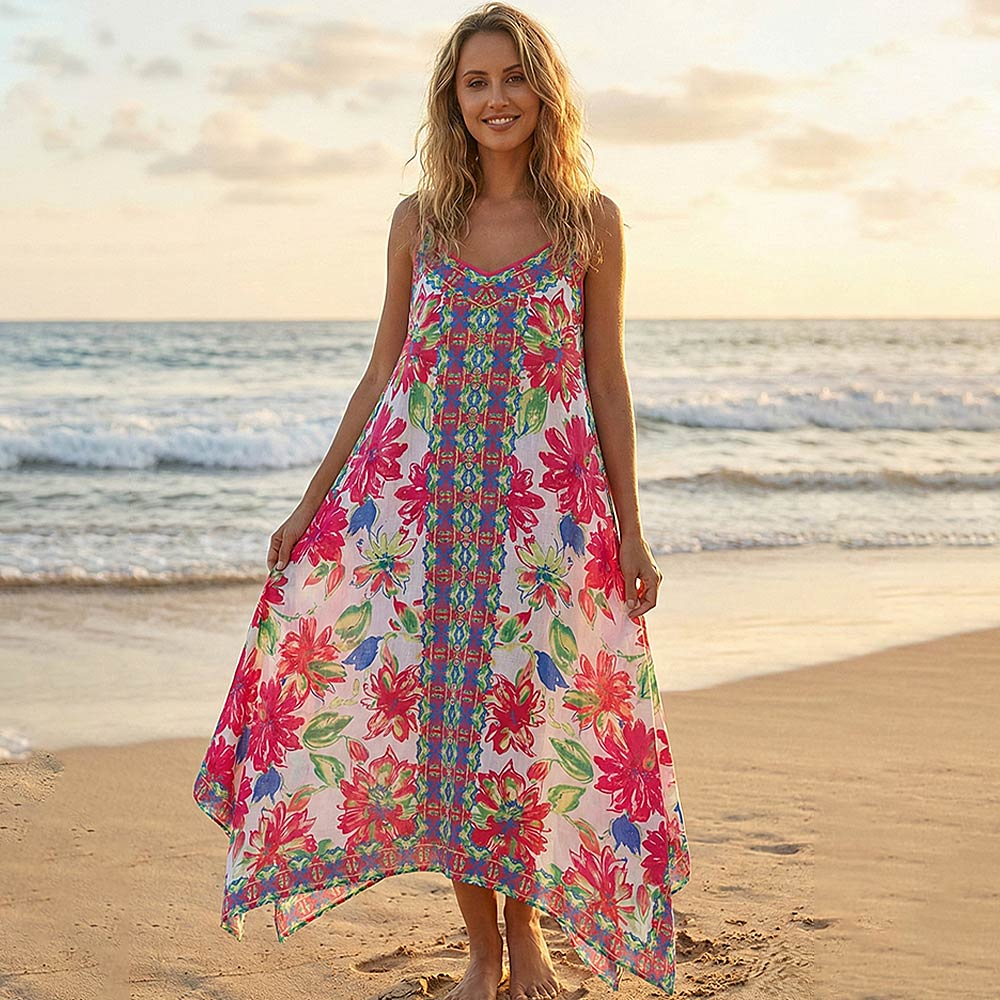 • This boho floral print beach maxi dress features a flowy silhouette with a breezy drape designed for warm weather wear. Ideal for vacations, beach days, resort styling, and casual summer outings, it offers effortless comfort and eye-catching appeal. A versatile statement piece for boutique collections, cruise wear, and easy day-to-night styling.
