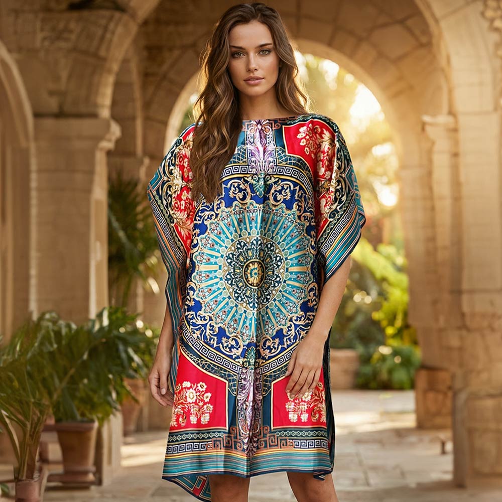 Details • Size : 35" X 36" • Material : 70% Viscose, 30% Silk • This medallion print kaftan midi dress features a flowing silhouette with an intricate statement pattern designed for effortless style and comfort. Perfect for resort wear, vacations, or boutique collections, it offers an easy fit that flatters a wide range of body types while delivering elevated, relaxed elegance.