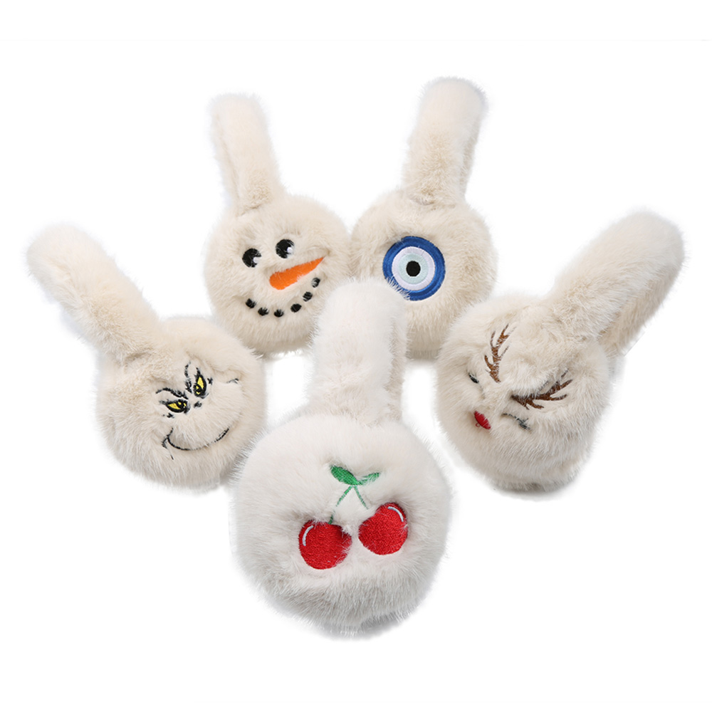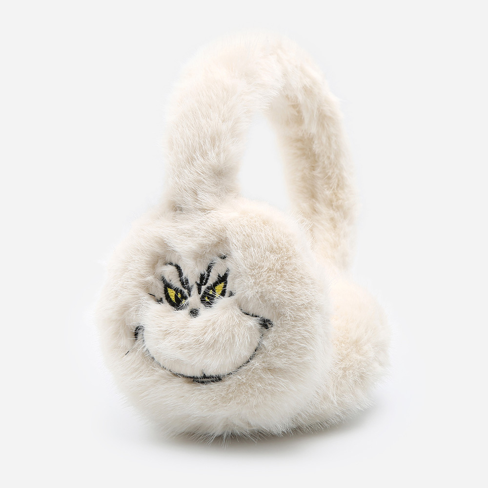 Details • Size : One Size • Stay warm and playful this winter with these plush earmuffs featuring an embroidered grinning face design. Their ultra-soft texture and whimsical charm make them perfect for adding personality to cold-weather outfits while keeping your ears cozy and comfortable.