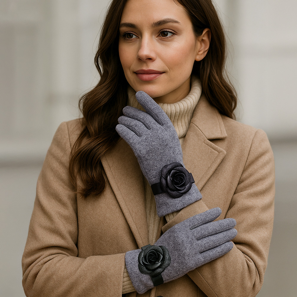 Details • Size : One Size • Material : 100% Polyester • Smart Touch • Chic gloves featuring a statement flower accent, combining fashion-forward design with everyday practicality. Made with smart touch technology for effortless phone and tablet use, these gloves keep hands warm while adding elegance and feminine charm to any winter outfit, casual or dressy.