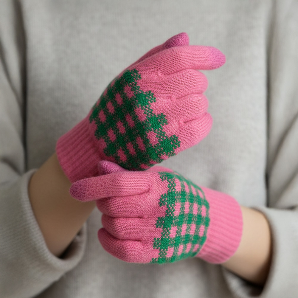 • Stay warm and connected with these knit touchscreen gloves featuring a festive plaid pattern. Designed for comfort and functionality, they allow you to use your devices without removing your gloves during chilly days.