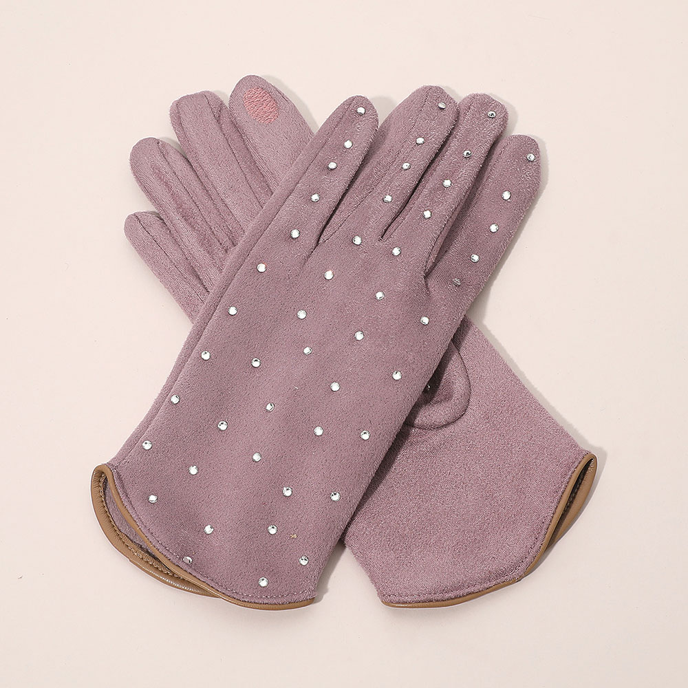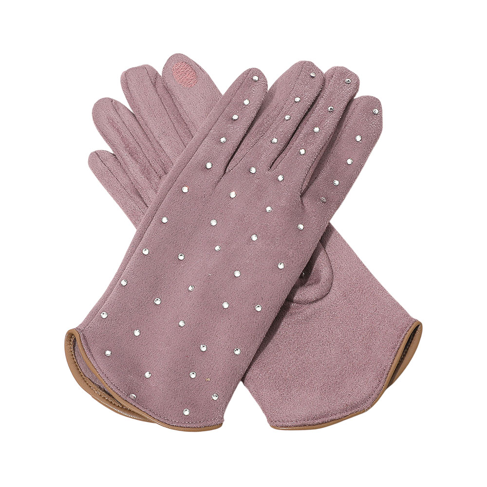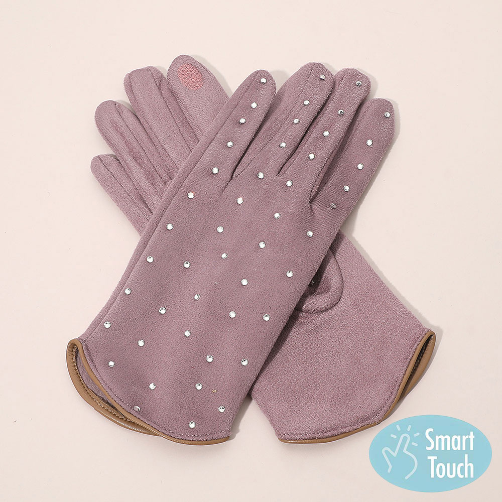 Details • Size : One Size (9" L) • Material : 100% Polyester • Smart Touch • Elegant smart touch gloves adorned with sparkling rhinestones and a sleek trim finish. These stylish gloves combine comfort with functionality, allowing touchscreen use while keeping hands warm and chic — perfect for both casual outings and sophisticated cold-weather looks.