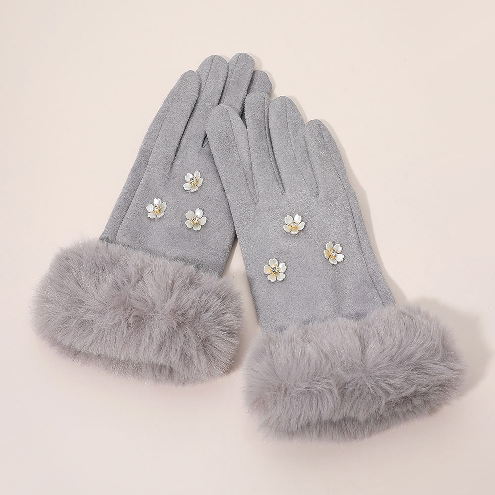 Rhinestone Flower Embellished Faux Fur Cuff Smart Touch Winter Gloves