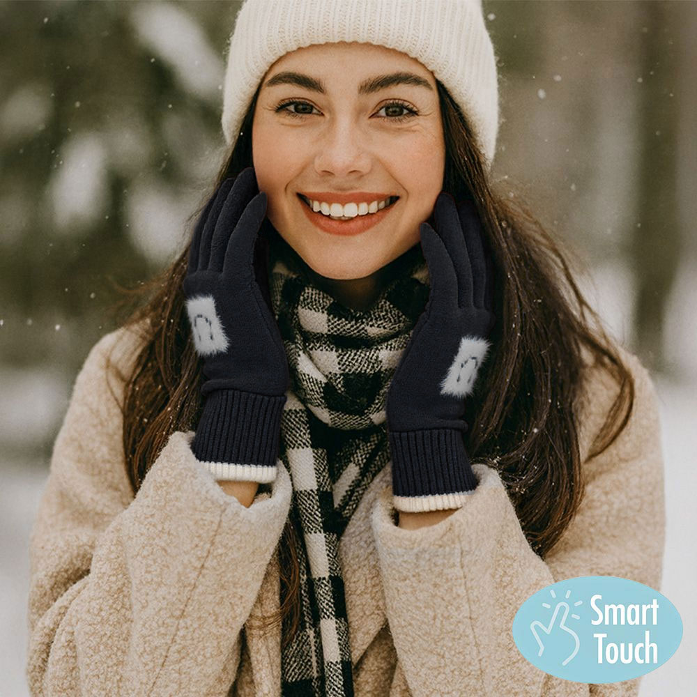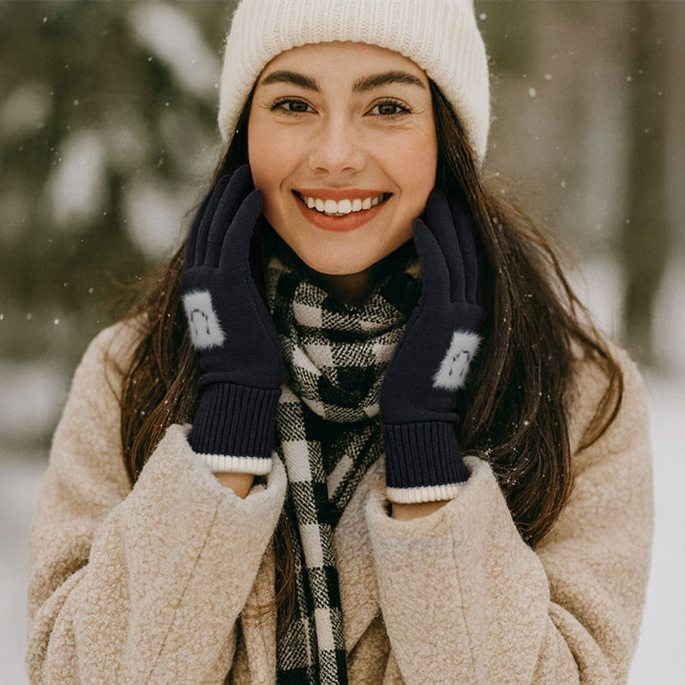 Details • Size : One Size • Material : 100% Polyester • Smart Touch • Cozy knit gloves with smart touch technology, featuring a playful face motif and contrast trim design. Perfect for keeping hands warm while allowing easy use of smartphones and tablets. A stylish and practical cold-weather accessory that combines fun detailing with everyday functionality.