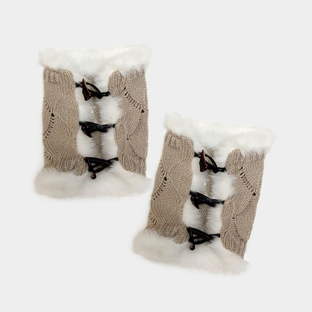 Details • Size : 5" X 8" • Material : Acrylic / Faux Fur • These faux fur knit boot cuff accessories add a cozy, winter-inspired charm to your favorite boots. Featuring a soft knitted pattern framed by plush faux fur trim and toggle accents, they offer both warmth and elegance—perfect for elevating cold-weather outfits with stylish flair.