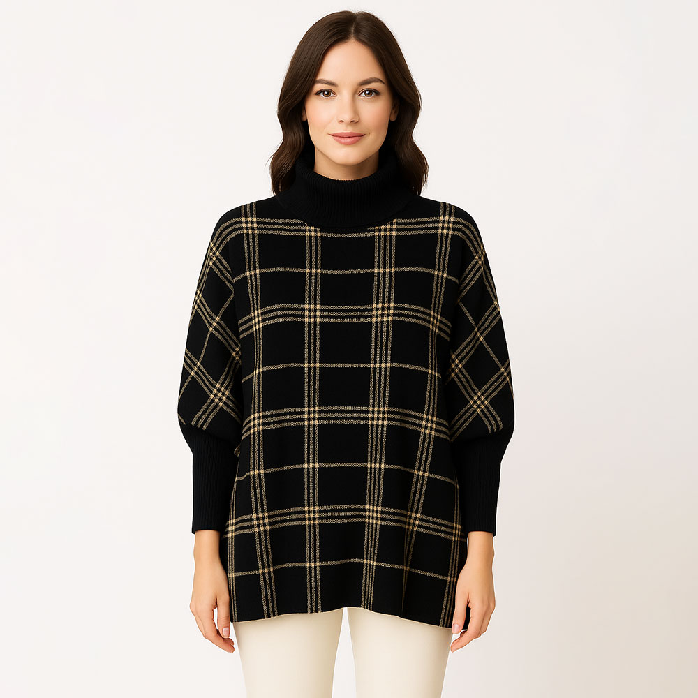 • Turtleneck poncho sweater with a clean checked pattern, relaxed draped fit, and long ribbed sleeves. A stylish and comfortable layering piece designed for everyday wear, offering a modern look with a soft, easy silhouette.
