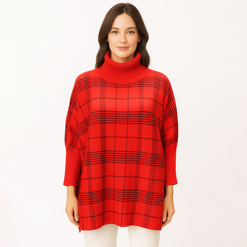 Checkered Turtleneck Knit Poncho