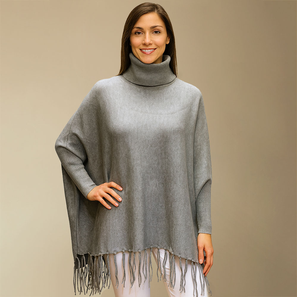 Details • Size : One Size • Material : 100% Acrylic • Stylish turtleneck poncho featuring a relaxed silhouette and flowing fringe hem, designed for easy layering and everyday comfort. Its soft drape and refined details create a chic look perfect for casual outings or polished ensembles.