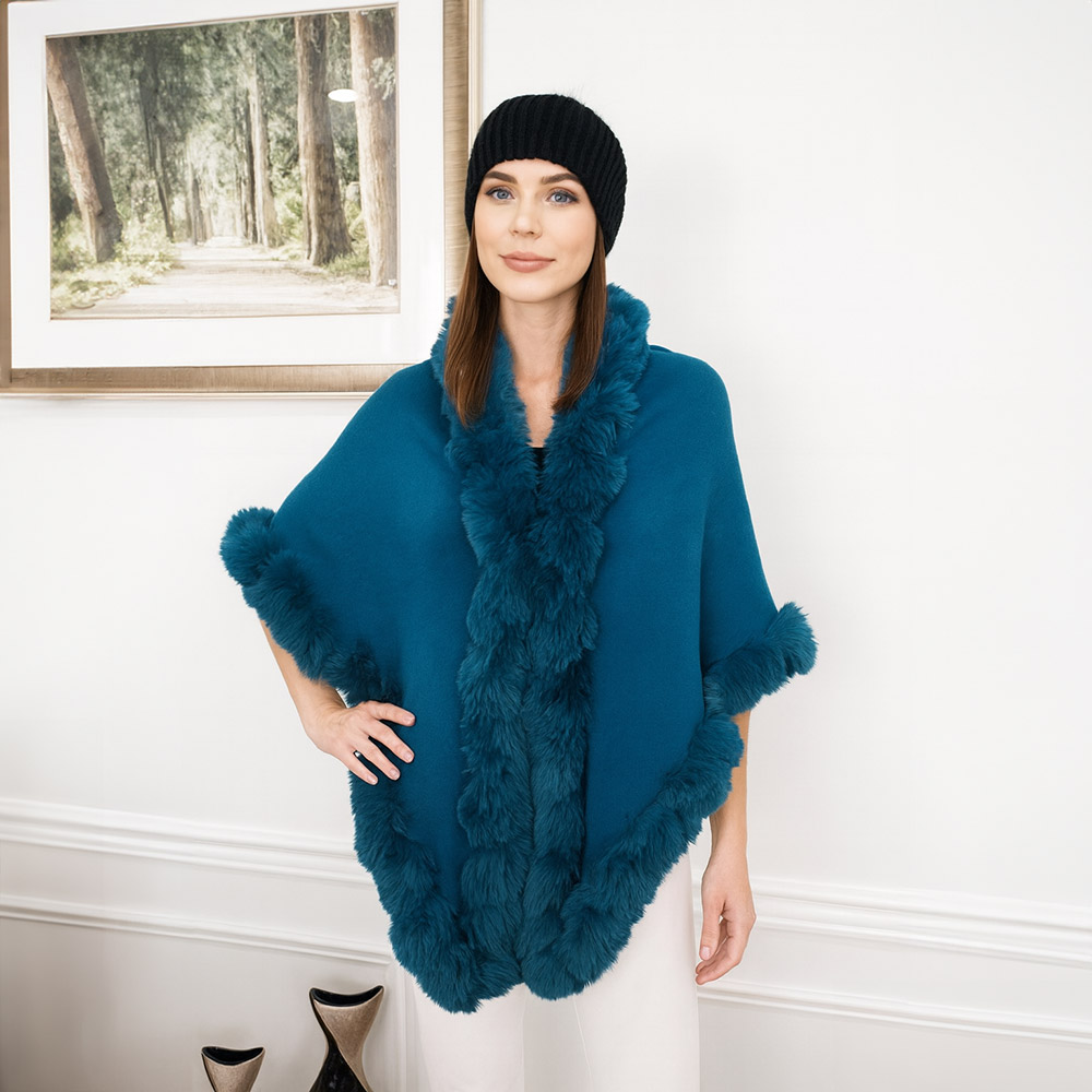 • This striking short-sleeve cape is designed with plush fur trim along the collar and edges, creating a dramatic silhouette. Perfect for layering, it blends comfort with refined style, making it a versatile statement piece for both casual and evening wear.