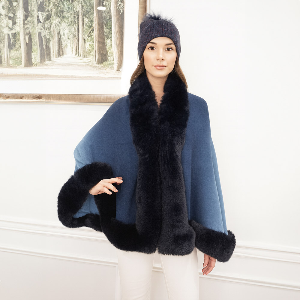 Details • Size : One Size • Material : 100% Acrylic • This sophisticated cape features a plush fur trim along the collar, hem, and sleeves, creating a refined silhouette. Perfect for layering in cool seasons, it offers timeless elegance and versatile wear, whether paired with casual looks or evening attire.