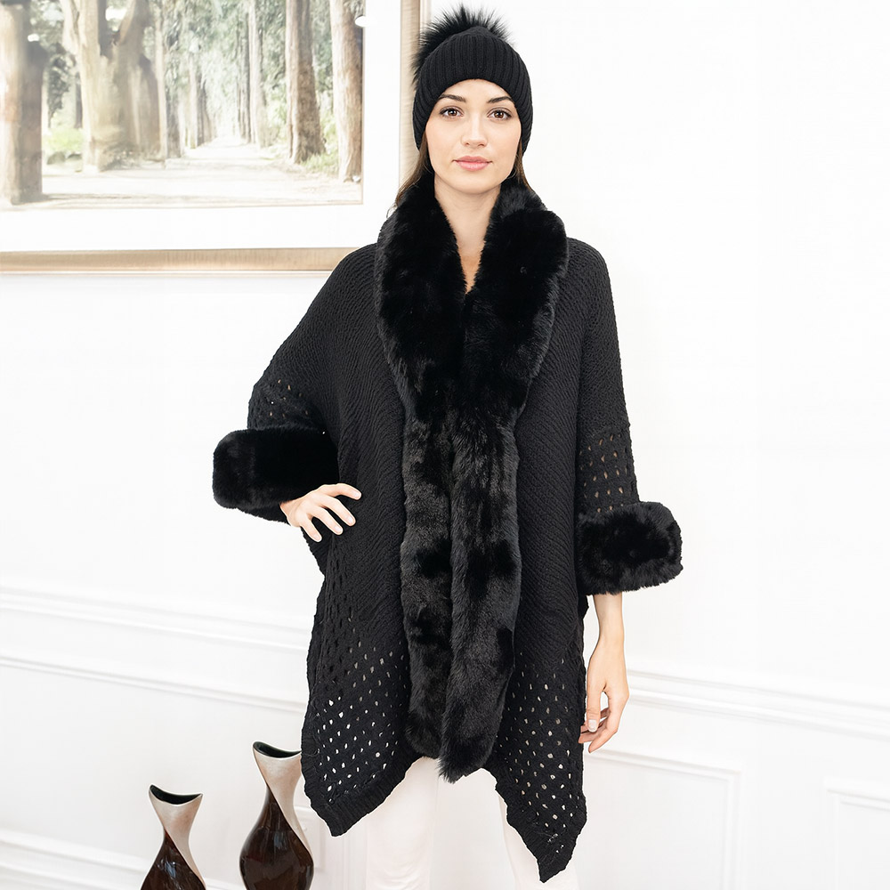 Details • Size : One Size • Material : 100% Acrylic • This stylish open-knit cape is accented with soft fur trim along the collar and cuffs, blending cozy texture with refined detail. A versatile layering piece, it drapes gracefully for day-to-night wear, offering warmth, sophistication, and timeless appeal.