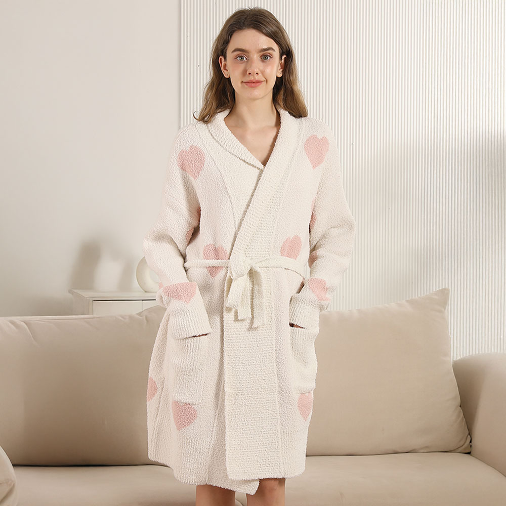 • Lounge with love in this heart-patterned knit robe, featuring a belted waist and cozy pockets. A sweet and comfy choice for relaxing at home in style.