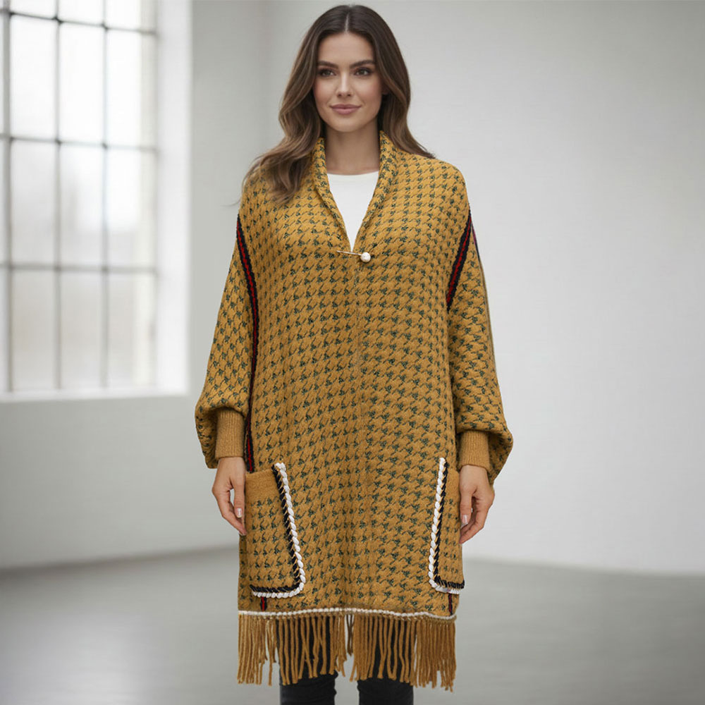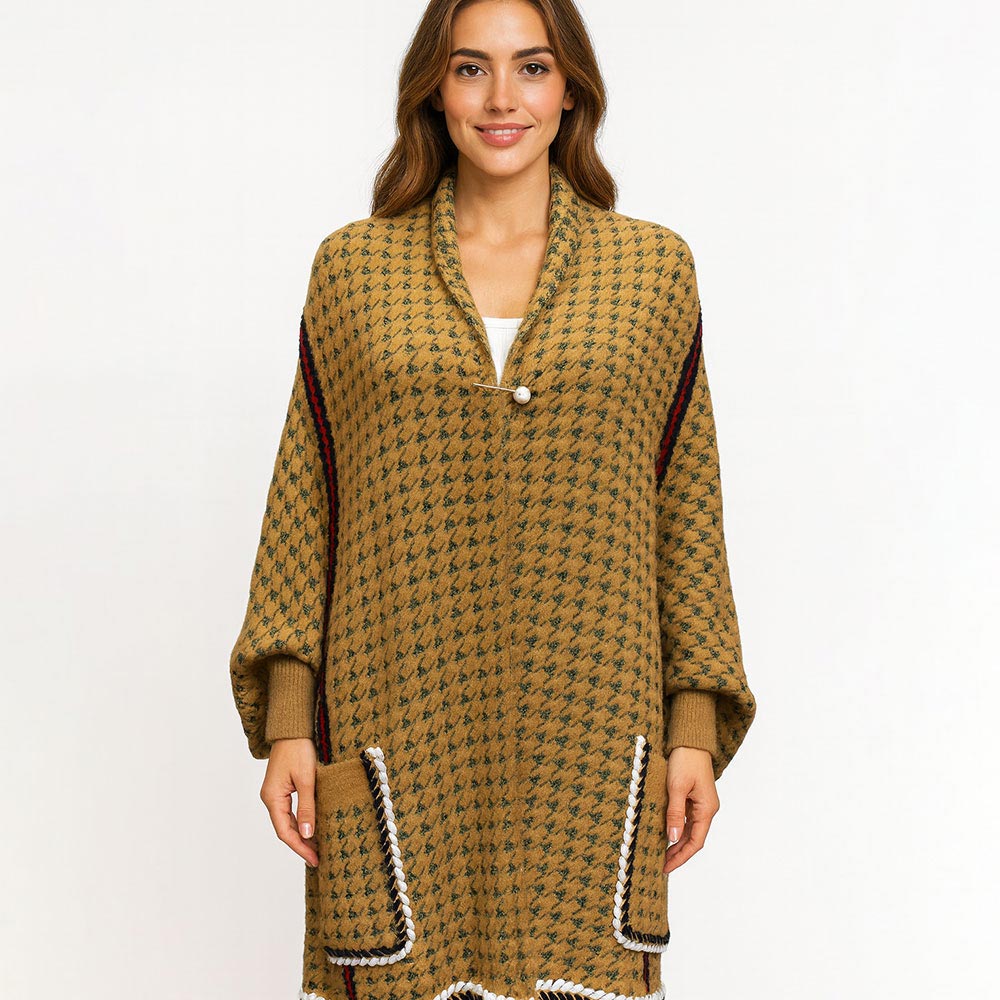 Details • Size : 44" X 54" • A chic open-front cardigan wrap featuring an oversized houndstooth pattern, contrast trim, roomy sleeves, and fringe hem. Designed for comfort and style, it layers effortlessly over casual or dressy outfits, making it perfect for everyday wear, travel, or gifting.