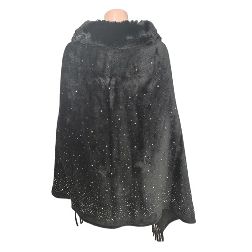 Details • Size : One Size • Material : 100% Polyester • Elegant faux fur shawl wrap featuring soft texture, fringe trim, and subtle rhinestone accents for added sparkle. Perfect for evening events, parties, or cold-weather outings, this luxurious wrap adds warmth and sophistication to any outfit with timeless charm.