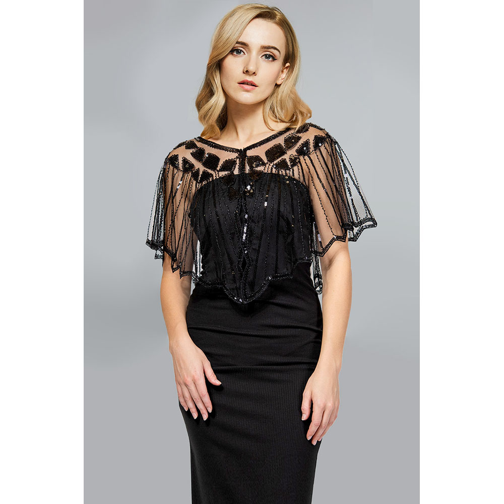 • This elegant overlay top showcases an intricate Art Deco–inspired design with detailed beadwork and fluid fringe movement for a dramatic yet refined look. Designed to layer effortlessly over dresses or fitted tops, it enhances evening wear, cocktail outfits, and special occasion styling. A statement piece ideal for boutiques seeking timeless glamour, eye-catching texture, and elevated fashion appeal.