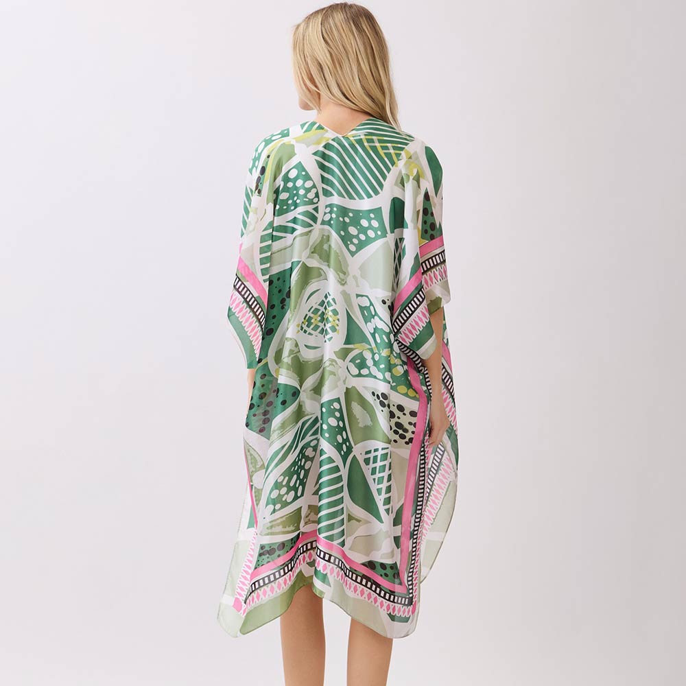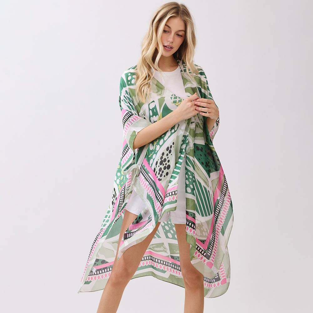 • This open front kimono poncho showcases a modern geometric pattern with a flowy, relaxed fit designed for effortless layering. Perfect for casual outfits, resort styling, or travel looks, it adds bold visual appeal while remaining lightweight and versatile for boutique assortments and gift-focused fashion collections.